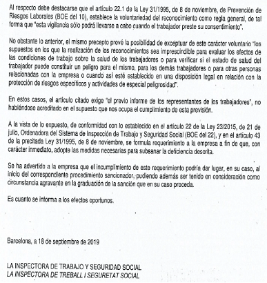 Desde CGT insistimos, en que la obligatoriedad de la revisión médica para el personal motorizado constituye una arbitrariedad y un abuso empresarial. Tras las denuncias formuladas por CGT ante Inspección de Trabajo en distintas provincias, siempre nos han dado la razón, requiriendo a Correos para que rectifique su actitud, bajo advertimiento de iniciar procedimiento sancionador; Y en ese sentido adjuntamos resolución de Inspección de Trabajo de Barcelona.
